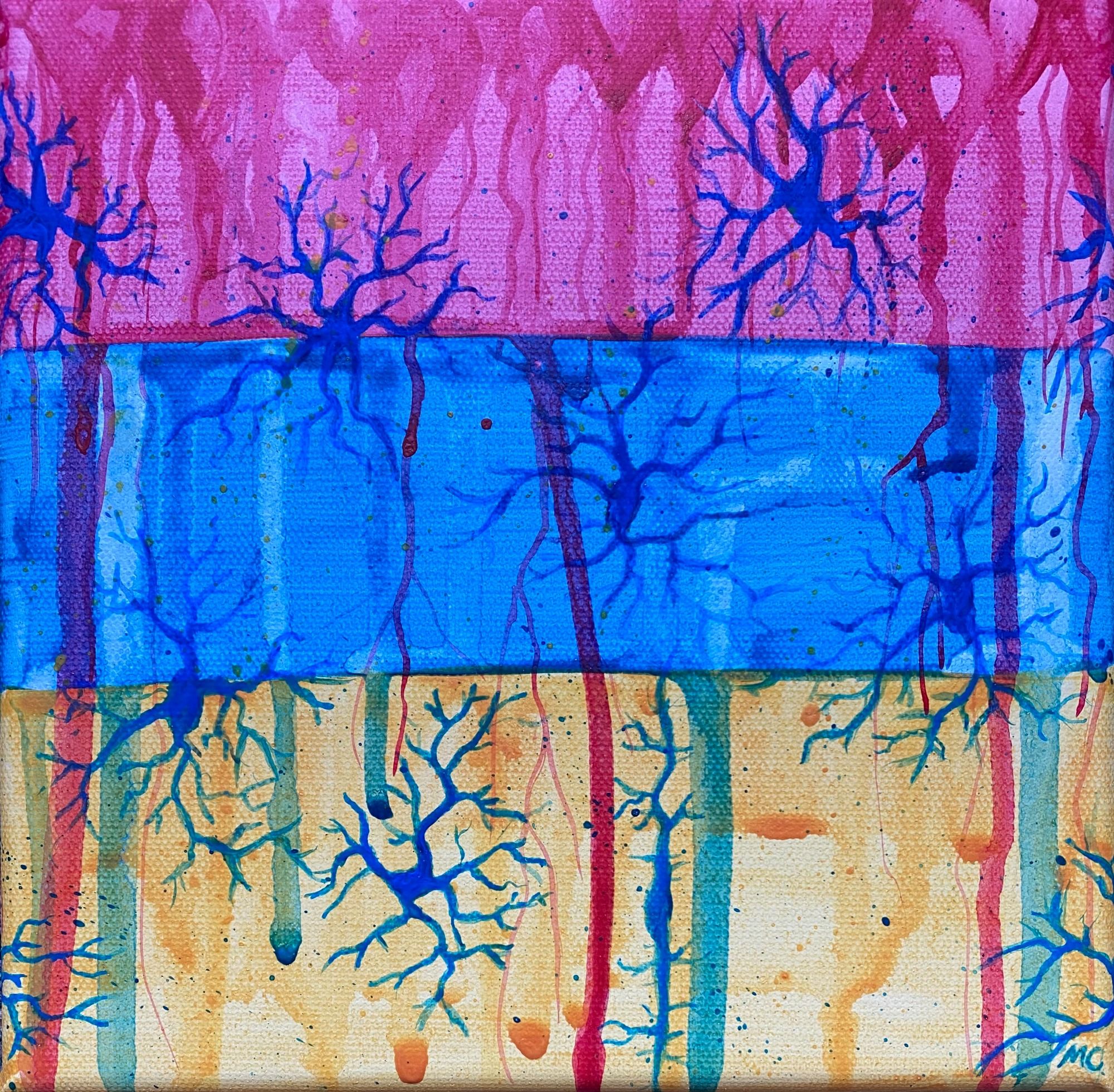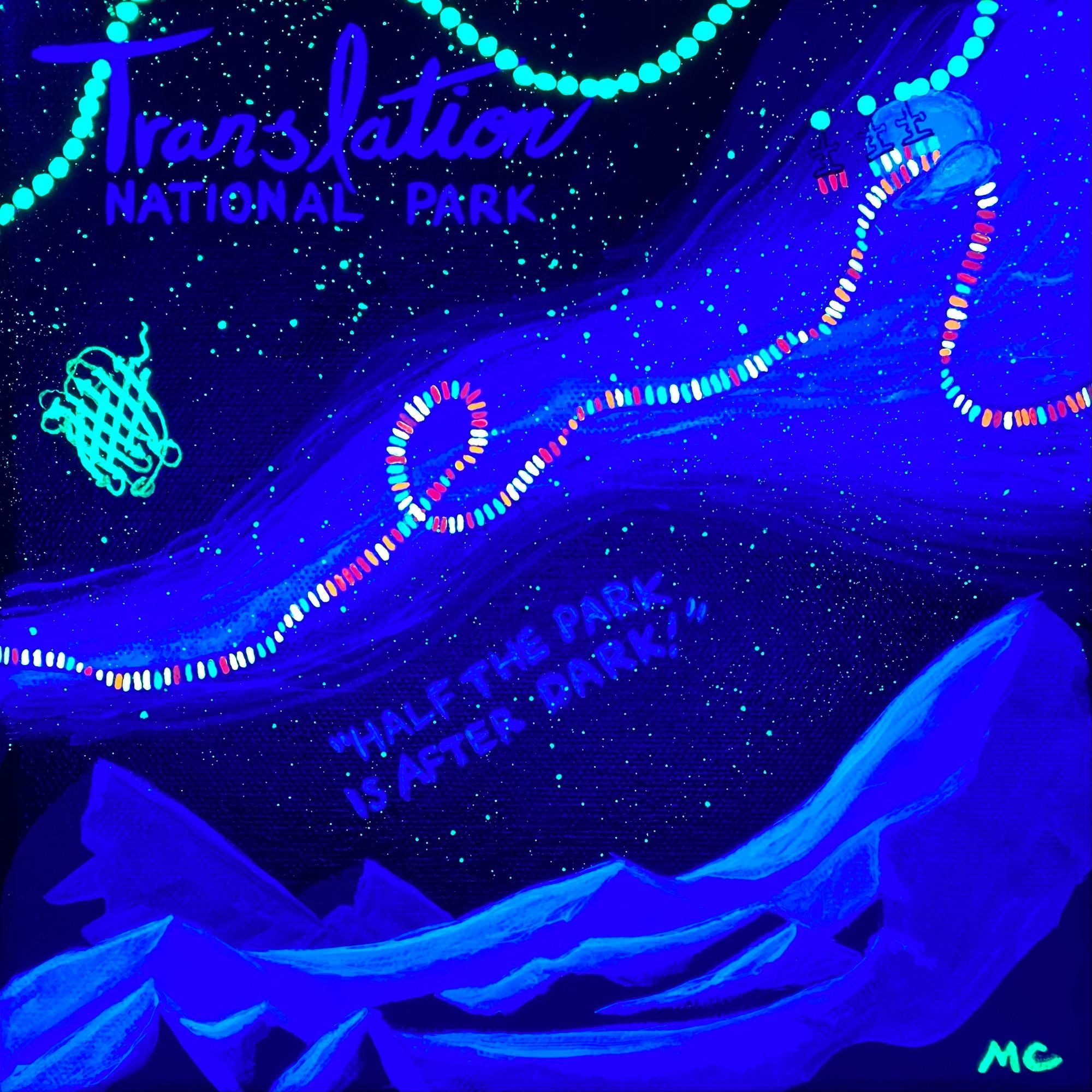 Acrylic on canvas comes to life with a bit of fluorescent paints and the right wavelength. These pieces are inspired by the hours I spent in a dark room with a confocal microscope, watching the cells I study reveal themselves. Scroll through to see paintings in daylight on the left and under a black light on the right. Alternate Text is here